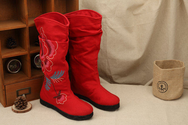 Mới thịnh vượng hoa mẫu đơn gió quốc gia thêu khởi động retro lớp cũ Bắc Kinh vải khởi động ống cao tăng khởi động nữ Giày ống