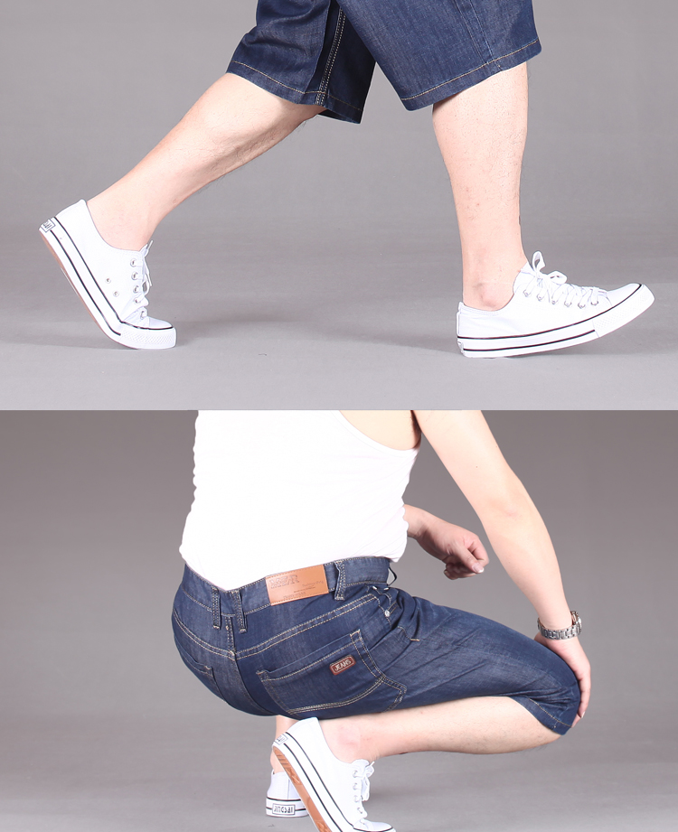 Mùa hè quần short denim mỏng phân bón trung niên nam để tăng chất béo Nutty bãi lớn quần ống túm lỏng quần mềm