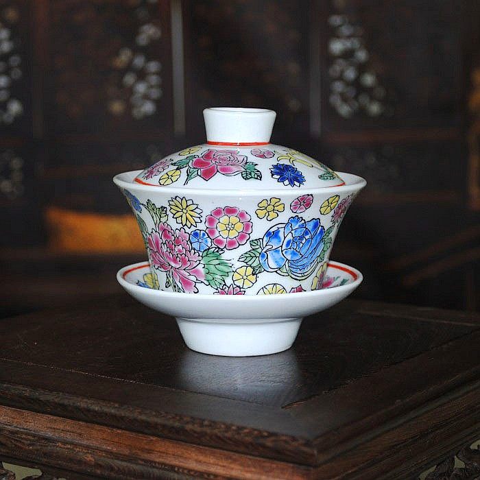 Jingdezhen Gốm Sứ Wenge Sứ Nhà Máy Hàng Hóa Đỏ Wanshou Wujiang Bìa Bát Vàng Xanh Retro Wedding Tea Set Cup Cup Trà sứ