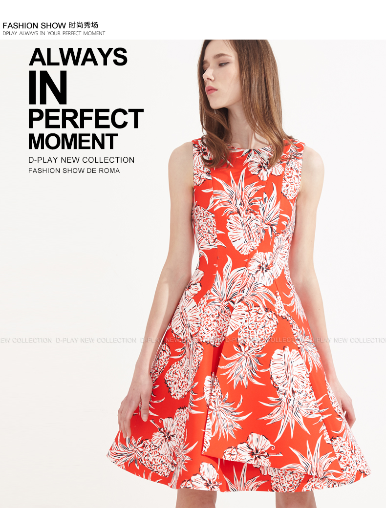 Mùa hè mới châu Âu và Mỹ dứa thời trang in mỏng đầm không tay eo cao một chiếc váy đỏ Sản phẩm HOT