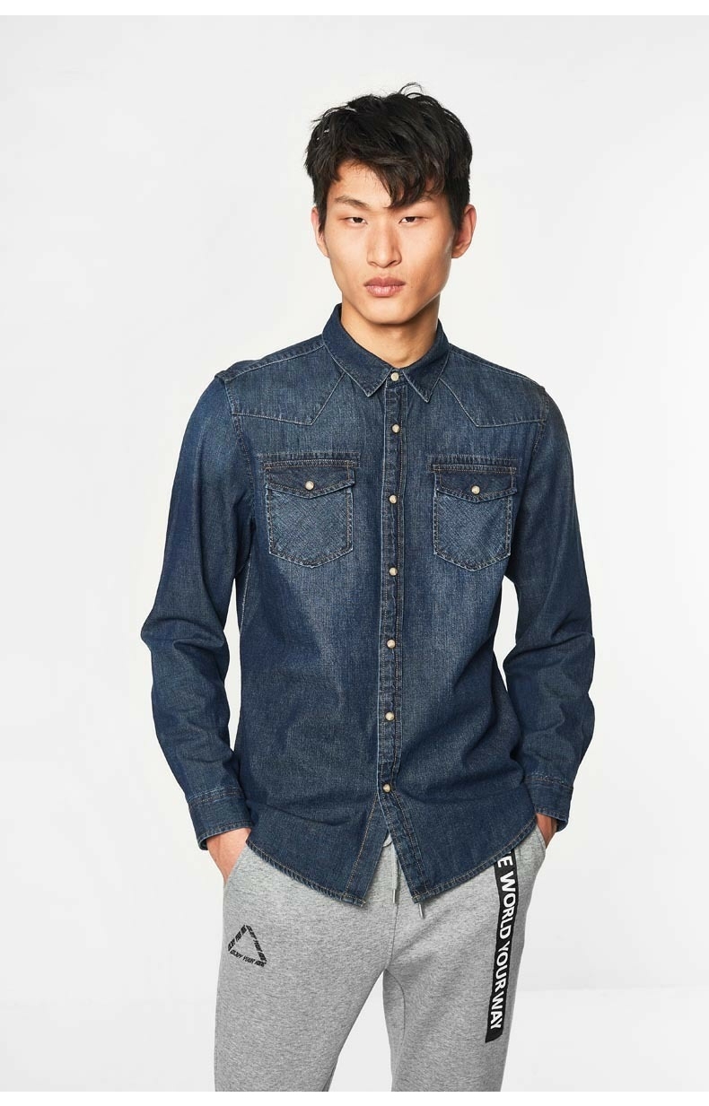 C & A retro màu xanh denim vá túi áo sơ mi nam 2018 đầu mùa xuân mới áo sơ mi denim CA200200338 Áo