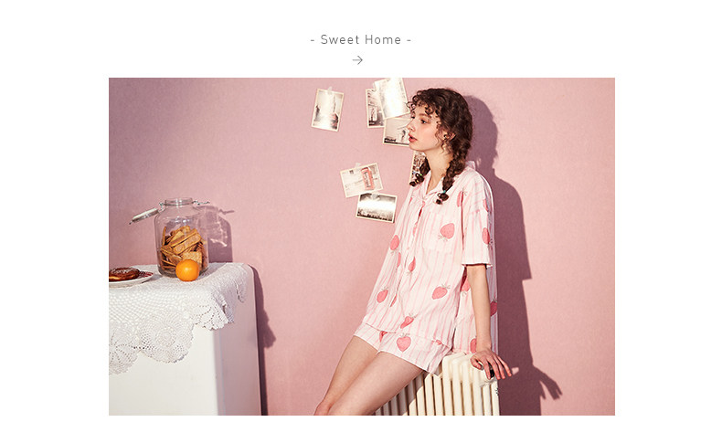 [Nhiều nếp gấp] đồ ngủ phụ nữ mùa xuân và mùa thu bông phù hợp với dâu tây ngọt ngào nữ nhà dịch vụ bông ve áo Giống cái