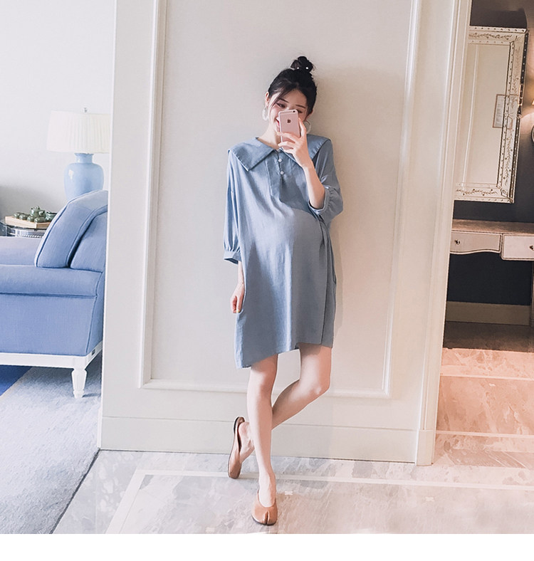 Thai sản mặc 2018 mùa hè mới vuông cổ áo bông và vải lanh tươi màu rắn lỏng thời trang phụ nữ mang thai dài ăn mặc Hàn Quốc Áo thai sản