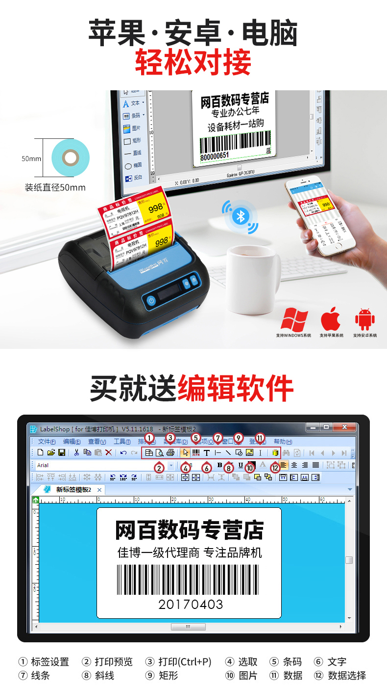 Máy in nhãn di động hàng trăm P80D Net không dây giá thẻ giá máy in nhãn mã vạch - Thiết bị mua / quét mã vạch